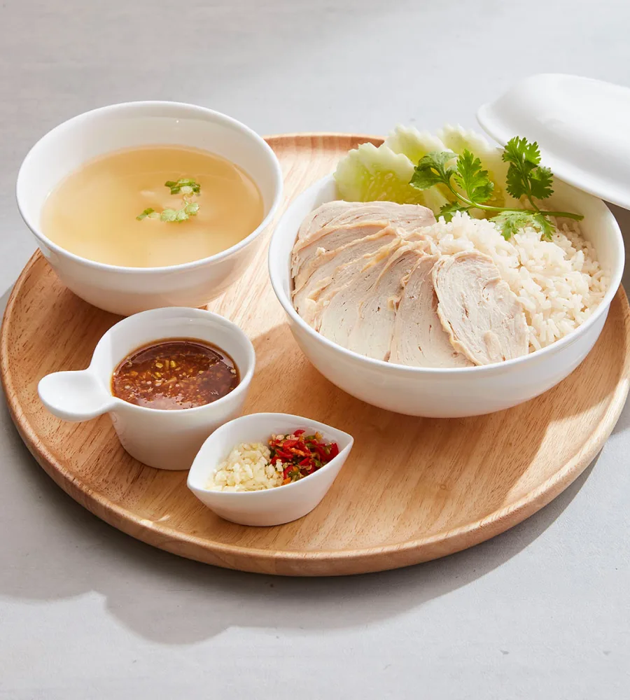 ข้าวมันไก่งวง เสิร์ฟพร้อมซุปผัก และนํ้าจิ้มรสเด็ด